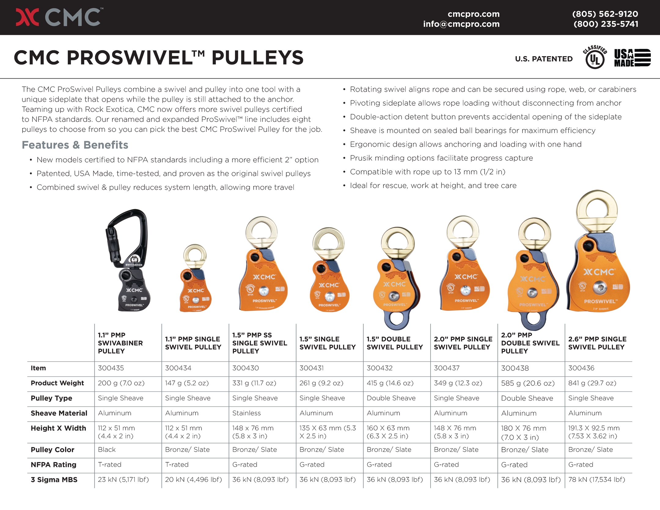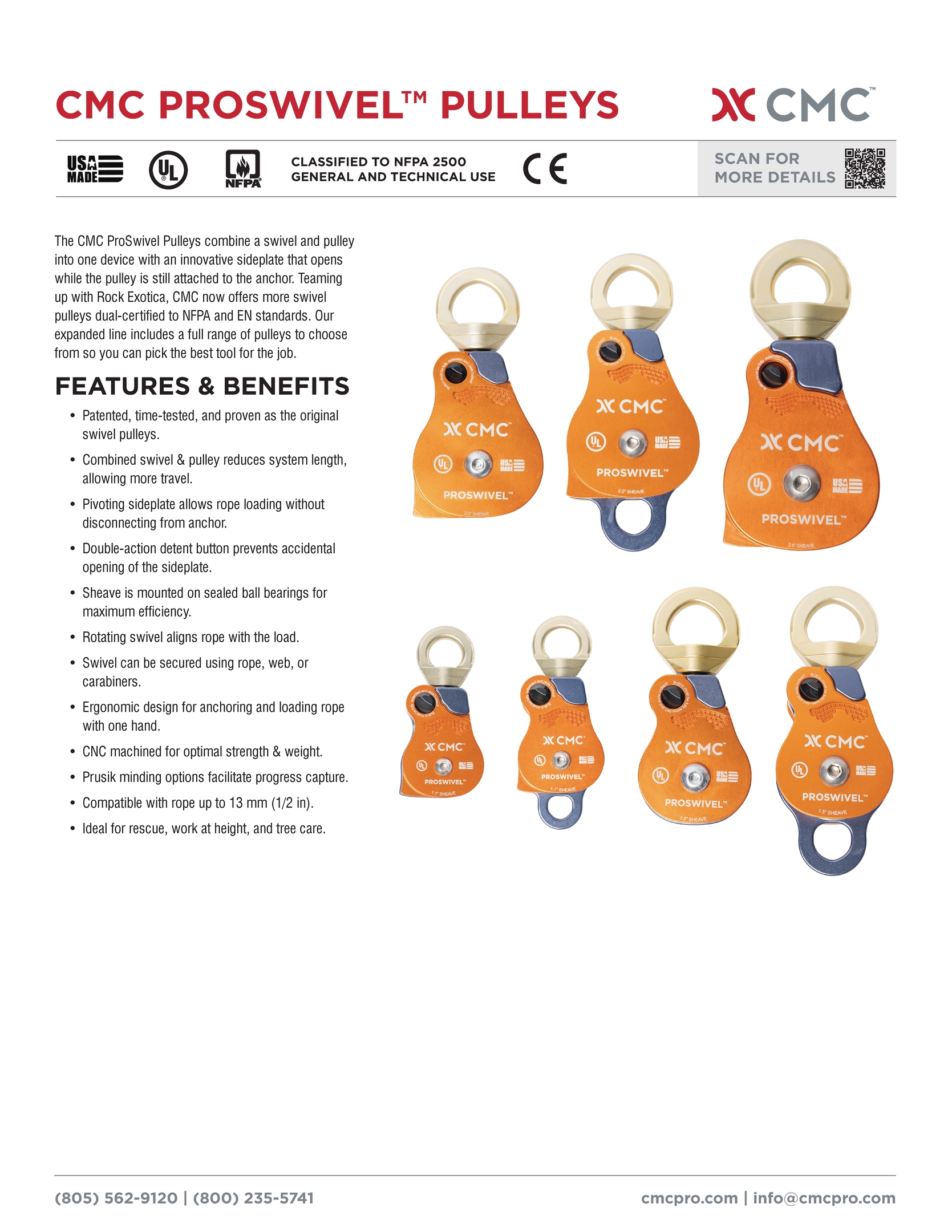 Teaming up with Rock Exotica, CMC now offers more swivel pulleys certified to NFPA and EN standards. Our expanded ProSwivel line includes eight pulleys to choose from. Select the best ProSwivel Pulley for the job, going bigger for more efficiency or smaller when weight is critical.